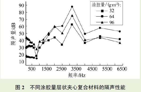 圖2所示3條曲線為固定熱壓時間5min、壓力3MPa,涂膠量分別為32、64、94g/m2時,復(fù)合材料的隔聲性能測試結(jié)果。