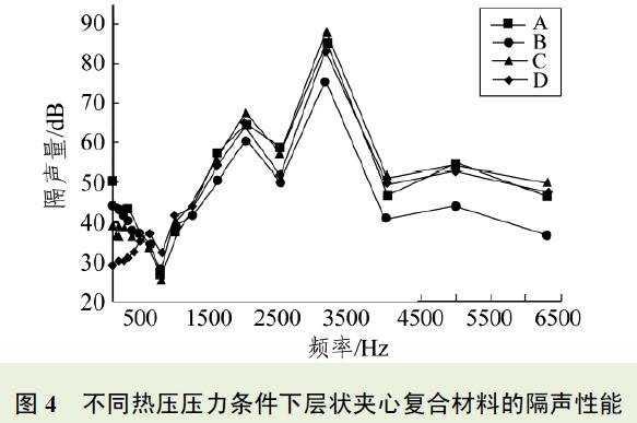 從圖4中可以看出,壓力3MPa時,試樣的隔聲性能相對較好,平均隔聲量為35.6dB。其原因是在此壓力條件下,密度板與阻尼材料緊密結(jié)合,夾心層不會因為壓力過大而產(chǎn)生變形。