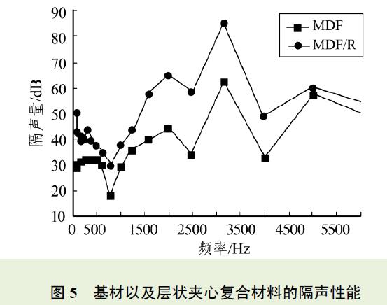 圖5結(jié)果表明,復(fù)合材料的隔聲性能優(yōu)于同等厚度的單一的密度板。復(fù)合材料既擁有木質(zhì)材料的優(yōu)點,又彌補了木質(zhì)材料隔聲性能差的不足。