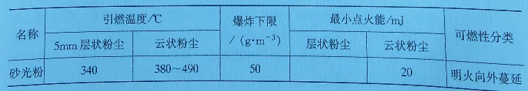 (4)砂光粉的爆炸性。粉塵爆炸是指在空氣中懸浮的粉塵急劇地氧化燃燒,同時(shí)產(chǎn)生大量的熱和高壓的現(xiàn)象。粉塵的粒徑越小,其表面積越大,如邊長(zhǎng)為1mm的立方體粉塵粉碎成邊長(zhǎng)為O.1mm的立方體后,其表面積由6mm2劇增至60mm2。由于表面積的增加,增大了與周?chē)橘|(zhì)的接觸面積,使其活潑性大為增加,在一定的溫度和濃度下就會(huì)引起爆炸,特別是遇有明火或機(jī)械摩擦與電器設(shè)備等發(fā)生的火花時(shí)均可能引起爆炸。砂光粉易燃易爆危險(xiǎn)性參數(shù),如表7-3所示。