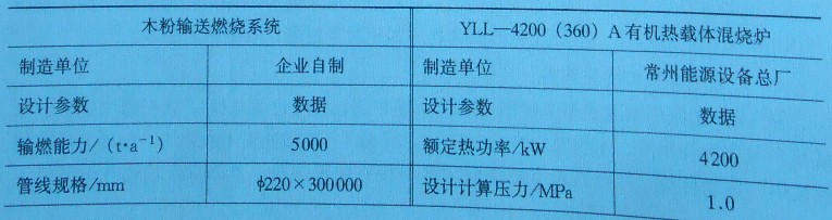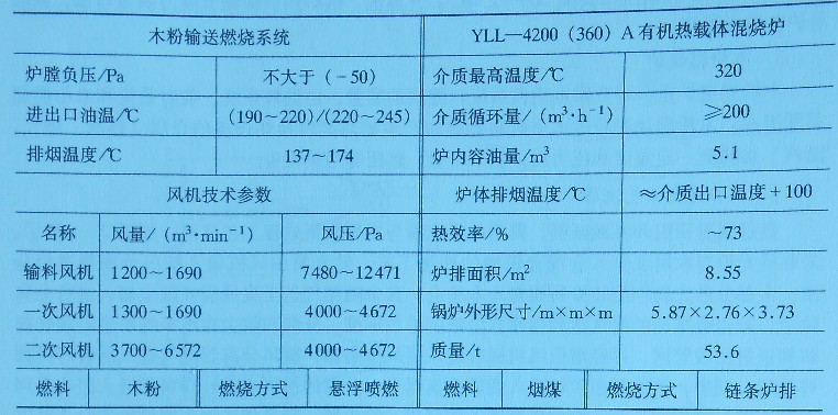 有機(jī)熱載體混燒爐于20世紀(jì)80年代初在我國(guó)誕生,是以煙煤、輕油、重油和燃?xì)鉃槿剂希瑢?dǎo)熱油為熱載體,通過(guò)循環(huán)泵強(qiáng)制閉路液相循環(huán)將熱能輸送給用熱設(shè)備,然后返回 ‘ 加熱爐再加熱的直流式特種工業(yè)爐。其主要特點(diǎn):①能在較低的運(yùn)行壓力下,獲得340度以下的工作溫度,具有低壓高溫的技術(shù)特性;②可實(shí)現(xiàn)穩(wěn)定的加熱和精確的溫度調(diào)節(jié),滿(mǎn)足不同的工況要求;在熱負(fù)荷變化的場(chǎng)合,熱效率均能保持在較佳水平;③閉路循環(huán),液相輸送熱能,熱損失少,節(jié)能效果顯著。所以,混燒爐被廣泛應(yīng)用于各行各業(yè),在林產(chǎn)工業(yè)系統(tǒng)主要用作熱壓和干燥,特別適合中小企業(yè)。近年來(lái)許多企業(yè)利用砂光粉和鋸屑作燃料,對(duì)有機(jī)熱載體混燒爐進(jìn)行改造,應(yīng)用效果不錯(cuò)。黑龍江萬(wàn)力木業(yè)有限公司根據(jù)企業(yè)的自身特點(diǎn),在吸取國(guó)內(nèi)外先進(jìn)技術(shù)的基礎(chǔ)上,采用了木粉懸浮噴燃技術(shù),對(duì)工廠(chǎng)型號(hào)為 YLL-4200A的有機(jī)熱載體混燒爐的燃燒方式進(jìn)行技改,增設(shè)木粉輸送燃燒系統(tǒng)。在有機(jī)熱載體混燒爐內(nèi)實(shí)現(xiàn)層(煤)懸(木粉)混合燃燒,取得了成效。有機(jī)熱載體混燒爐、木粉輸燃系統(tǒng)技術(shù)參數(shù)如表7-4所示。