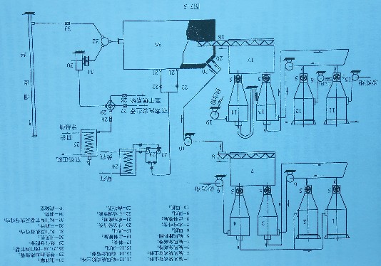 木粉不僅僅可以用噴放的方式送人鍋爐爐膛燃燒,也可以通過(guò)輸送機(jī)送人燃木鍋爐的布料器布料燃燒,但由于木粉的特性決定其布料器必須設(shè)置防回火和防爆裝置。對(duì)于原企業(yè)鍋爐為煤粉鍋爐的,其木粉可以通過(guò)螺旋輸送機(jī)送人輸煤管道與煤粉一道燃燒,這種方式目前在我國(guó)有多家企業(yè)應(yīng)用,效果不錯(cuò)。圖7-3為粉屑與重油混合燃燒的工藝流程圖,砂光粉獨(dú)立設(shè)一個(gè)系統(tǒng),木屑及其他廢料設(shè)一個(gè)系統(tǒng),根據(jù)木屑的數(shù)量供給情況用重油來(lái)調(diào)節(jié)鍋爐的連續(xù)運(yùn)行,這種方式目前有多家高中密度纖維板企業(yè)采用。相類(lèi)似的工藝布置,如圖7-4所示。這種工藝布置圖不但適合中密板企業(yè),也適合刨花板等人造板企業(yè)。圖7—5為適合大型高中密度纖維板企業(yè)采用的熱能系統(tǒng)工藝流程圖。