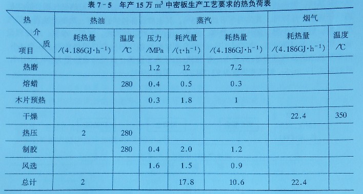 年產(chǎn)15萬(wàn)m3纖維板生產(chǎn)工藝要求的熱負(fù)荷如表7-5所示。