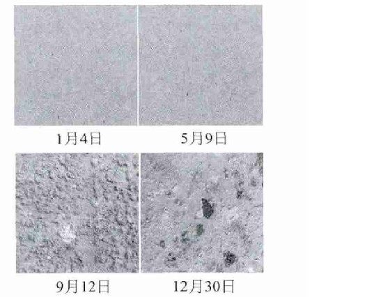 試驗材料為綠洲森工有限公司提供的干燥狀態(tài)下使用的家具用中密度板 (MDF-FN REG) , 規(guī)格2 440 mm×1 220 mm×15 mm, 生產(chǎn)日期為2015-12-26, 一個批次共4張。試驗材料均勻靜置于倉庫避光陰涼處, 從2016-01-04儲存至2016-12-30。儲存期間, 倉庫中溫濕度隨自然條件變化而變化, 在高溫高濕的梅雨季節(jié), 由于具有較強的吸濕性, 中密度板含水率大幅增加從而發(fā)生霉變腐朽。中密度板在不同時間表面外觀情況見圖1。