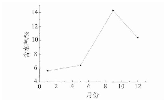 通過試驗和計算得出:1月、5月、9月、12月, 含水率分別為:5.6%、6.4%、14.3%、10.4%。以月份為橫坐標(biāo), 含水率值為縱坐標(biāo)繪制含水率隨時間變化趨勢見圖2。