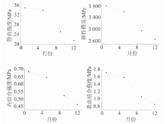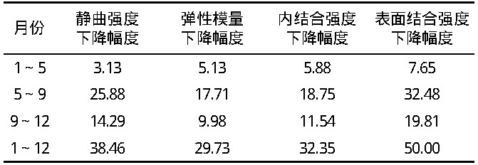由圖3可見, 中密度板的靜曲強度、彈性模量、內(nèi)結(jié)合強度、表面結(jié)合強度力學(xué)性能呈相同變化規(guī)律, 即在1~5月下降幅度較小, 5~9月下降幅度較大, 9~12月下降幅度趨緩。1~5月中密度板表面未見明顯的霉變, 其力學(xué)性能下降幅度較小;5~9月中密度板經(jīng)歷黃梅季節(jié)后發(fā)生霉變, 其力學(xué)性能下降幅度較大;9~12月中密度板表面霉菌群衰敗, 其力學(xué)性能下降幅度趨緩。