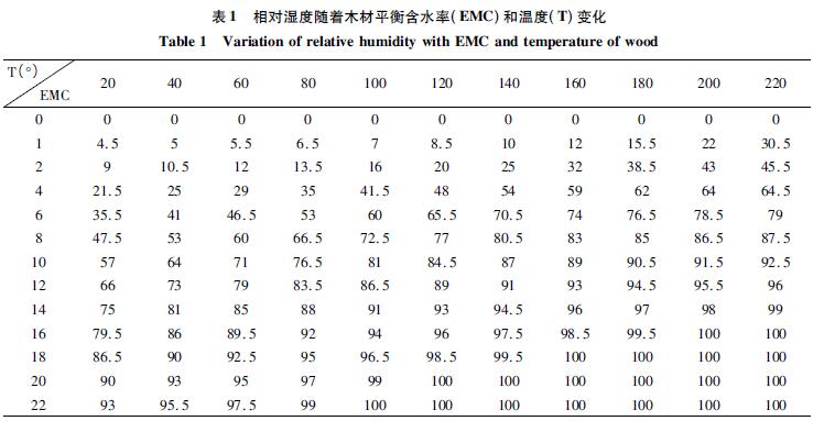 基于Engelhardt(1979)所測數據,纖維板熱壓傳熱傳質過程中木材平衡含水率和內部溫度兩個影響因素作為輸入因子,相對濕度作為輸出樣本,參見表1。