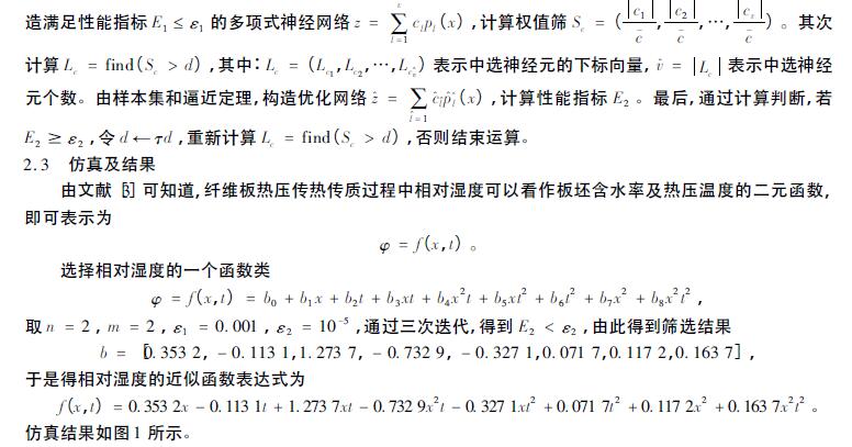 文獻 研究了非線性熱傳導方程中未知系數的反演問題,采用中心差分離散方程得到迭代矩陣,通過建立牛頓迭代格式求解迭代增量,反演出方程中未知系數。文獻運用分離變量法、齊次化原理、定義算子的方法,求解了微波加熱過程中木材內部溫度的熱傳導模型中熱源的近似解析解。本文利用多輸入單隱層神經網絡逼近多項式方法及文獻的理論,參考中密度纖維板熱壓干燥過程中的溫度及濕度傳遞規律,結合中密度纖維板的構造特點以及與纖維板傳熱相關的物理性質,通過訓練已有的實驗數據,利用單隱層前向神經網絡對纖維板熱壓過程中木材內部溫度、濕度以及含水率之間的函數關系進行參數識別,該模型能夠直觀地反映纖維板熱壓干燥過程中相對濕度與熱壓溫度及含水率之間的函數關系,實現對板坯含水率的定量分析,因此對纖維板干燥過程中的質量控制有一定的指導作用;在分析纖維板熱壓過程中纖維板內部傳熱傳質規律的基礎上,建立相關的熱濕模型,從定量的角度去分析問題,為實際應用提供數值化直觀數學模型。