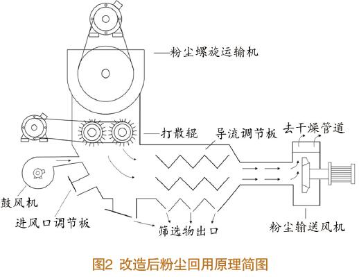 1)在出料螺旋運輸機及風箱之間增加一臺打散輥。砂光粉塵通過打散輥打散后形成分散粉塵,以利于后面的篩選。