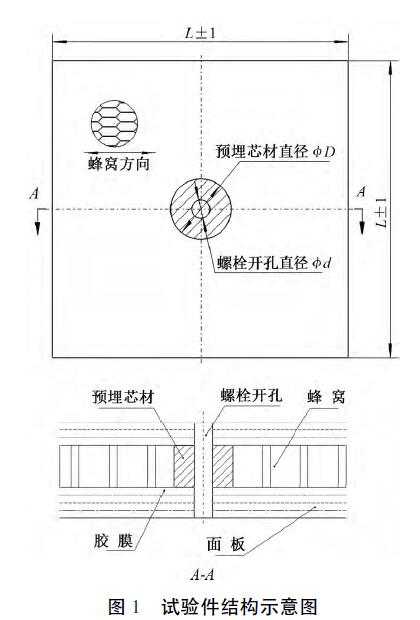 復(fù)合材料蜂窩夾層結(jié)構(gòu)一般由上下面板、芯材、粘接層等組成,其上鑲嵌有埋件,形成傳力接頭。埋件結(jié)構(gòu)是結(jié)構(gòu)設(shè)計(jì)中廣泛使用的連接形式,是蜂窩結(jié)構(gòu)與其他結(jié)構(gòu)連接時(shí)的主要受力部件。根據(jù)制備工藝的不同,埋件分為預(yù)埋件和后埋件,埋件多使用金屬埋件,多采用后埋工藝。目前埋件夾層結(jié)構(gòu)的破壞機(jī)理尚不明確,埋件的拉脫強(qiáng)度一般通過試驗(yàn)獲得。